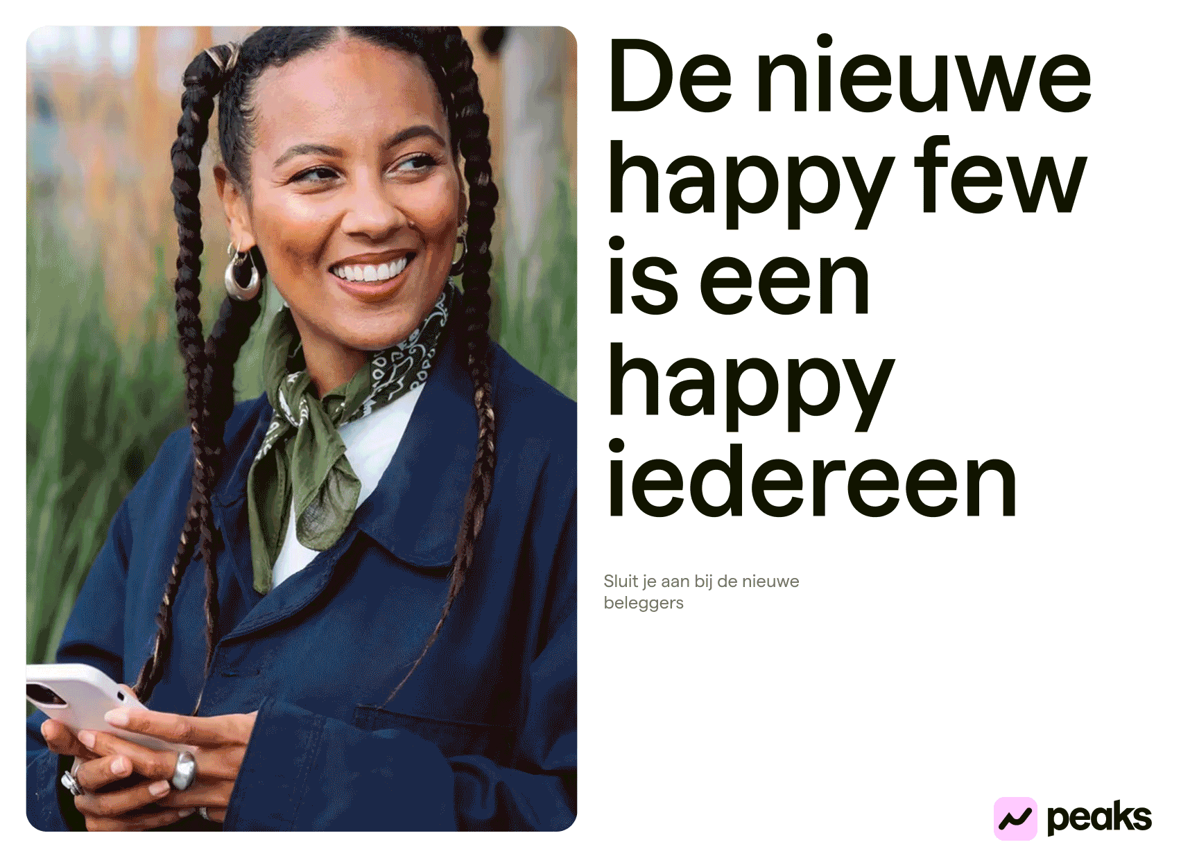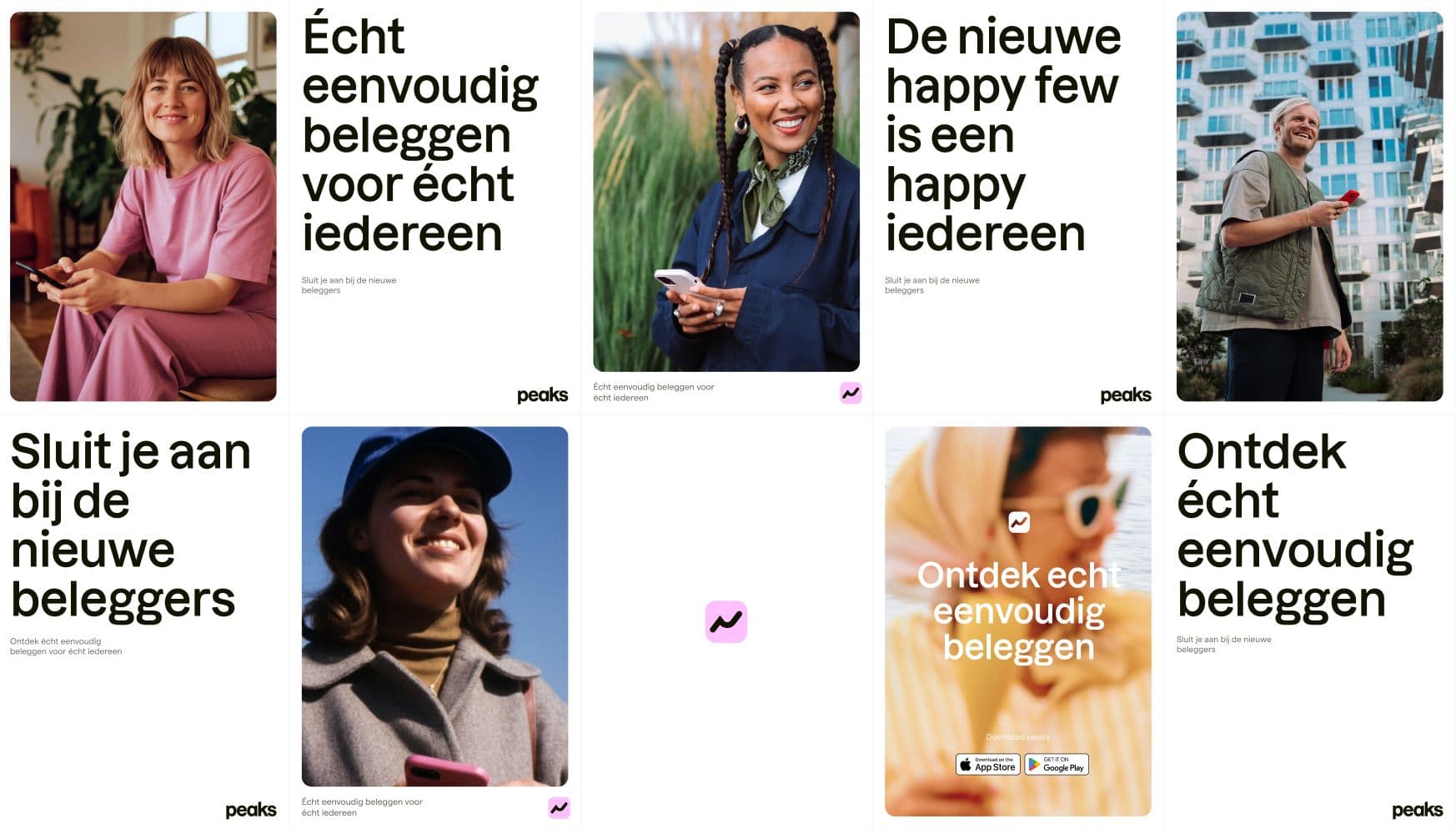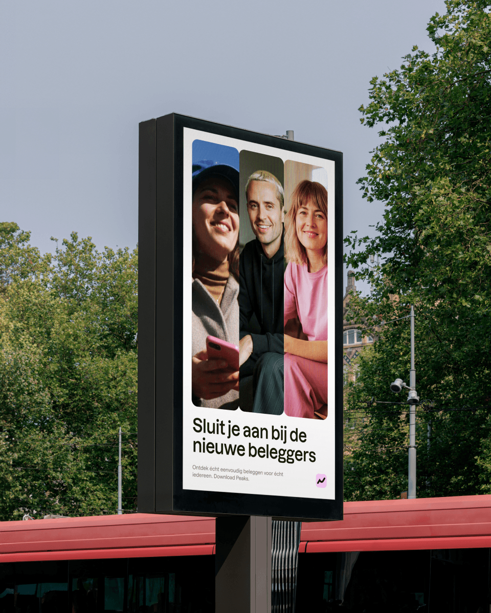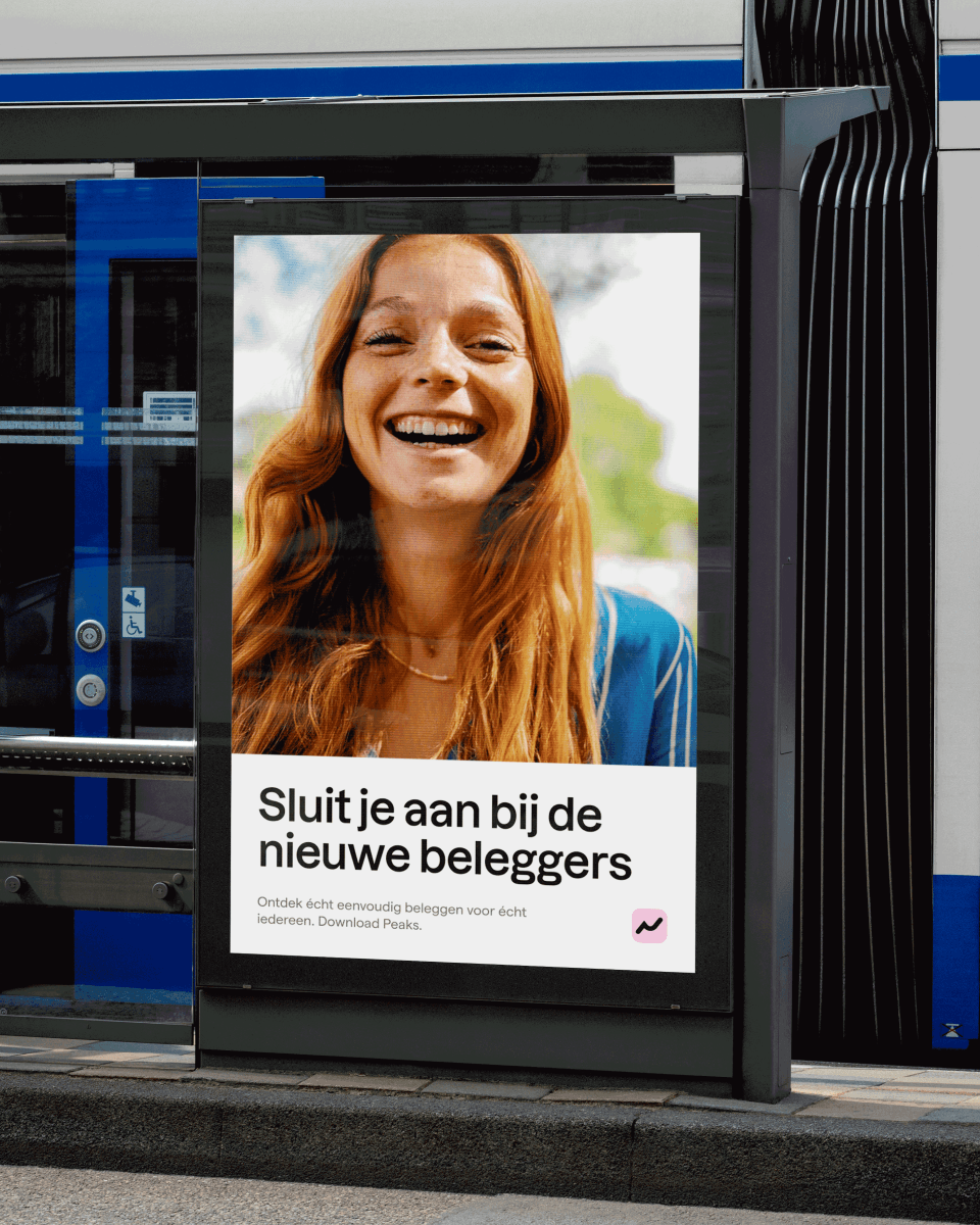 Stock investing only for the happy few? Not if you ask Peaks. They make investing 'echt eenvoudig voor echt iedereen' —accessible, optimistic and made to feel like something you want to be part of. This fresh brand strategy was the starting point for a new Peaks look and launch campaign. The new happy few is a happy everyone.